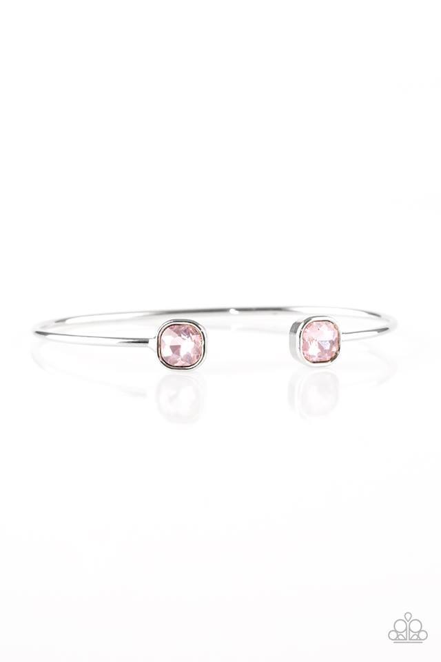 Attached to a curling silver bar, square pink rhinestones are pressed into silver fittings, creating a dainty cuff.