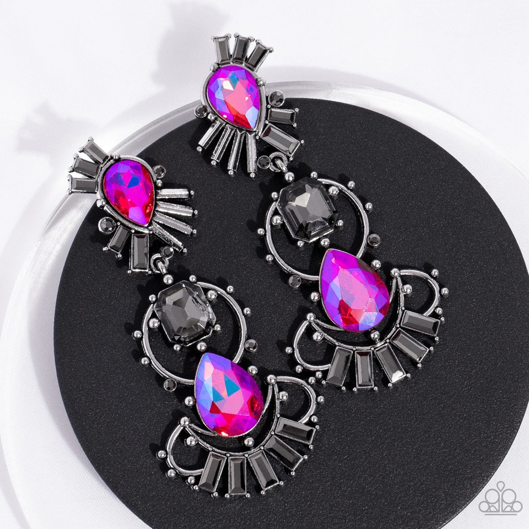 A cosmic collision of iridescent pink teardrop gems and a solitaire smoky emerald cut rhinestone haphazardly adorns studded silver frames. Dotted in round and emerald cut hematite rhinestone accents, the abstract frames stack into a stellar lure. Earring attaches to a standard post fitting. Due to its prismatic palette, color may vary.