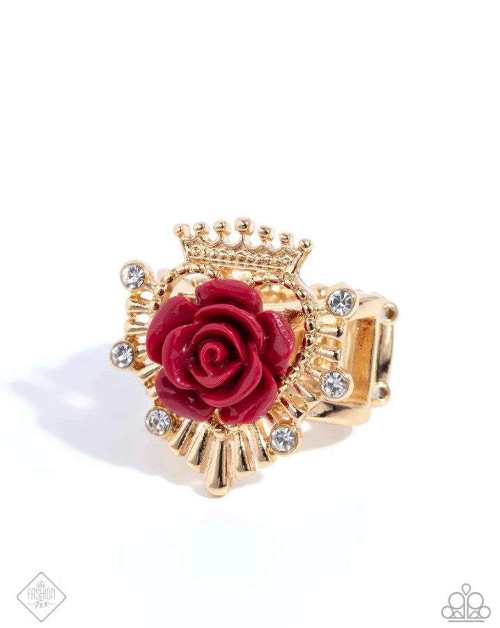 Blooming atop a gold, royal crown-inspired, airy coat of arms sporadically dotted with dainty white rhinestones, a wine acrylic rosette glistens atop the finger for a fashionably formal centerpiece. Features a stretchy band for a flexible fit.